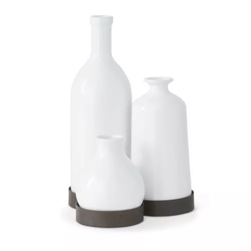 K&K Interiors Cluster of 3 White Ceramic Vases Attached To Rusty Metal Base